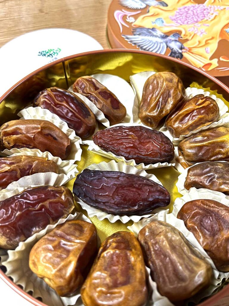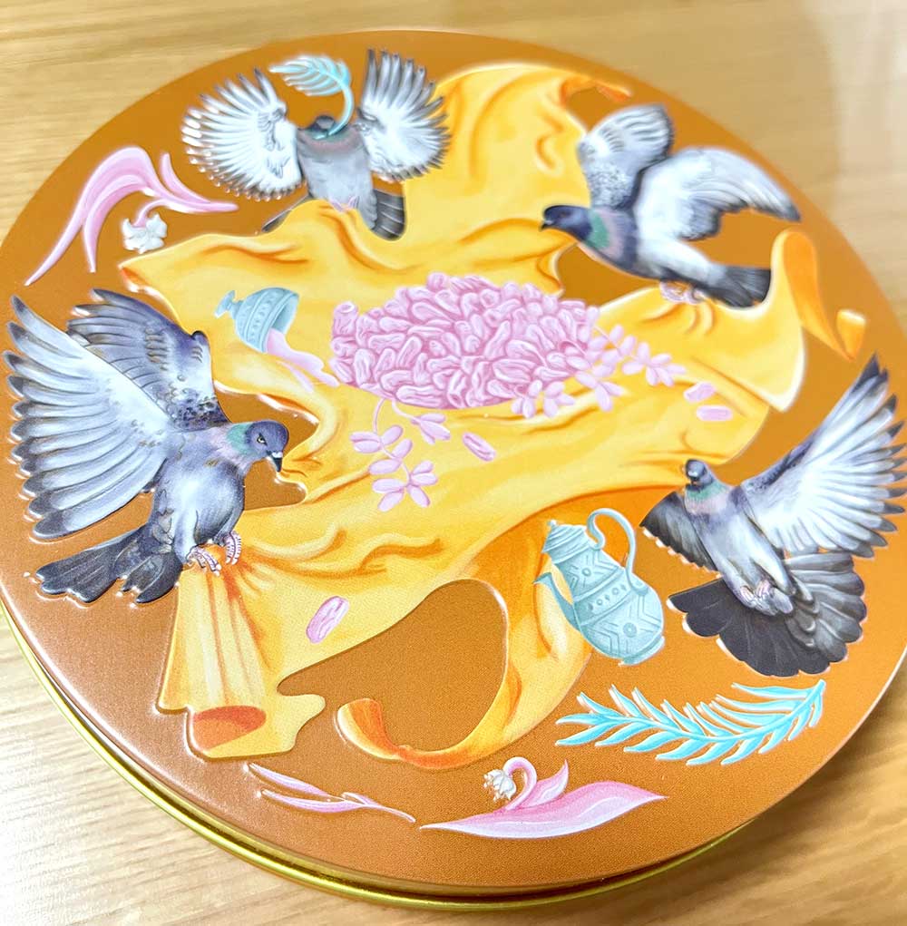 色々なデザインの缶入りの物がもしかしたらあったのかも。ですが、当日は入館したのが夜でしたのでゲットできたのは「鳩」模様のこちら。残っていたデーツはこれだけ、でも買えてラッキー☆